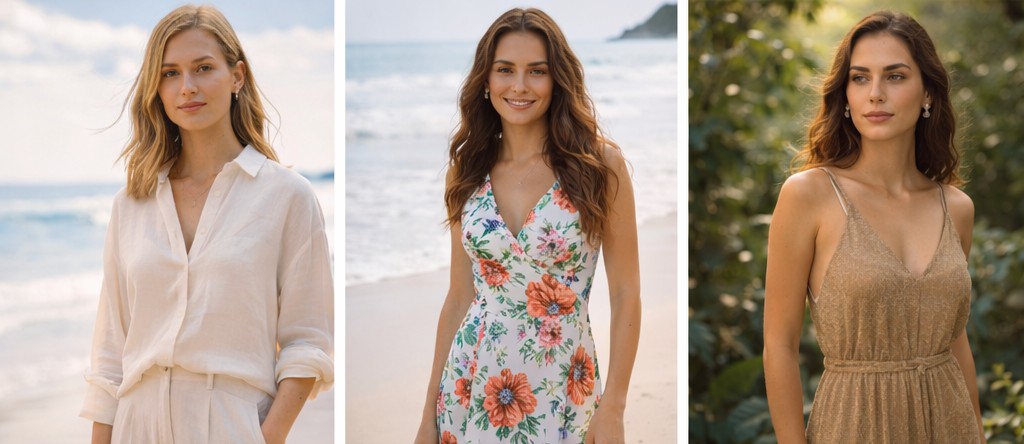 Tecidos naturais como linho e algodão trazem um visual refinado, fresco e atemporal — e funcionam tanto na praia quanto na cidade.